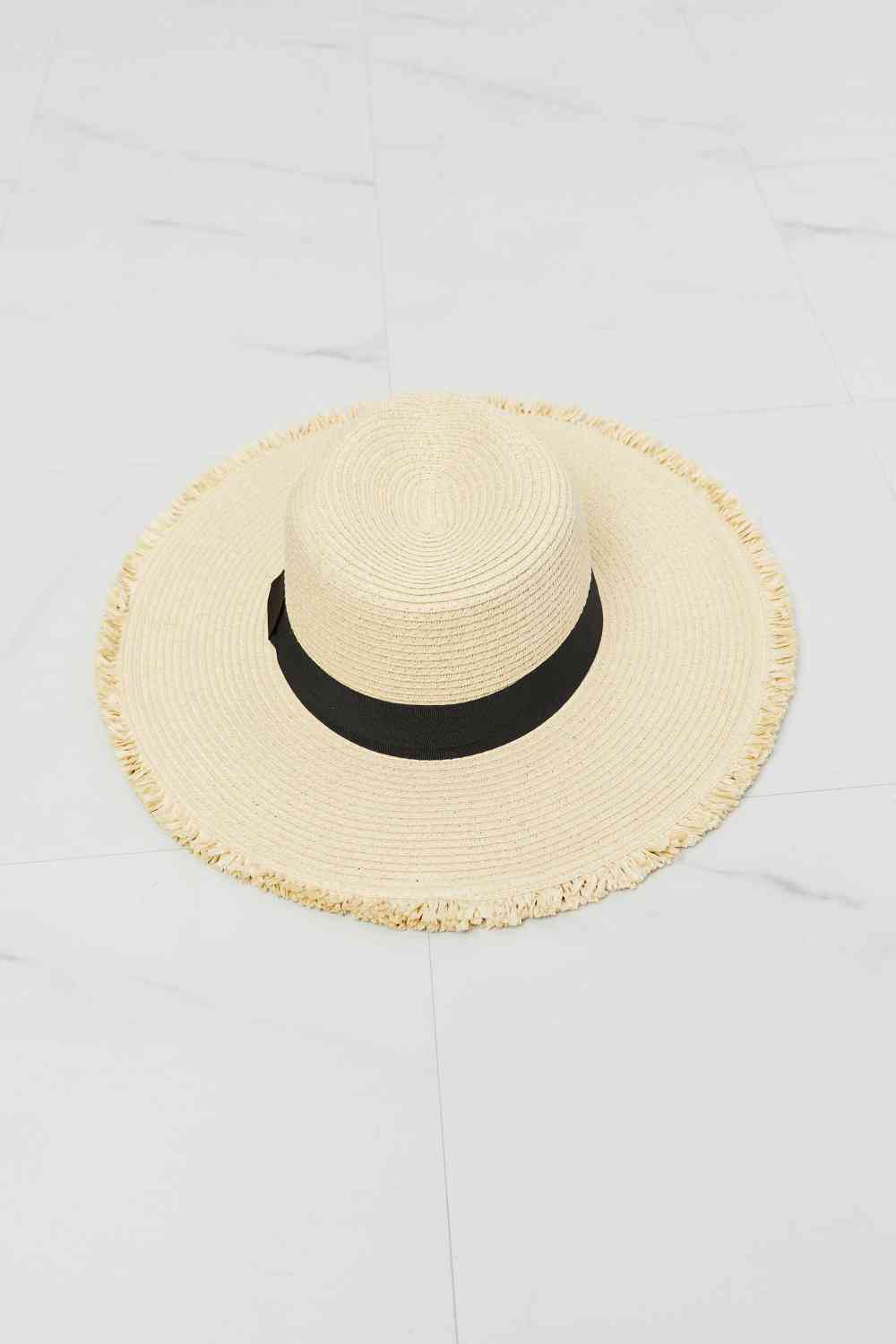 A simple straw hat with a fringe rim detailing that will protect you face from the sun and keep you stylish! This hat feature a black ribbon detail and adjustable straps.